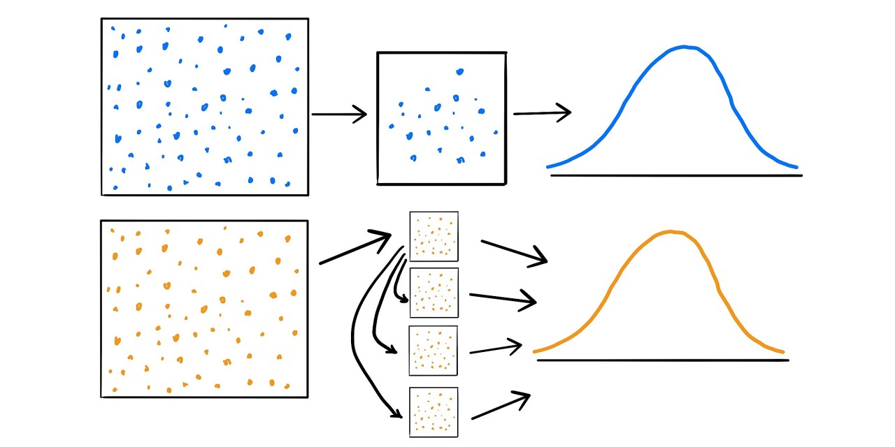 샘플링을 할 때는 단순랜덤 복원추출법을 사용하여 동일한 크기의 표본을 여러개 생성하므로, 특정 데이터가 여러 샘플에 포함될수도 있고 혹은 어떠한 샘플에도 포함되지 않을 수 있다.